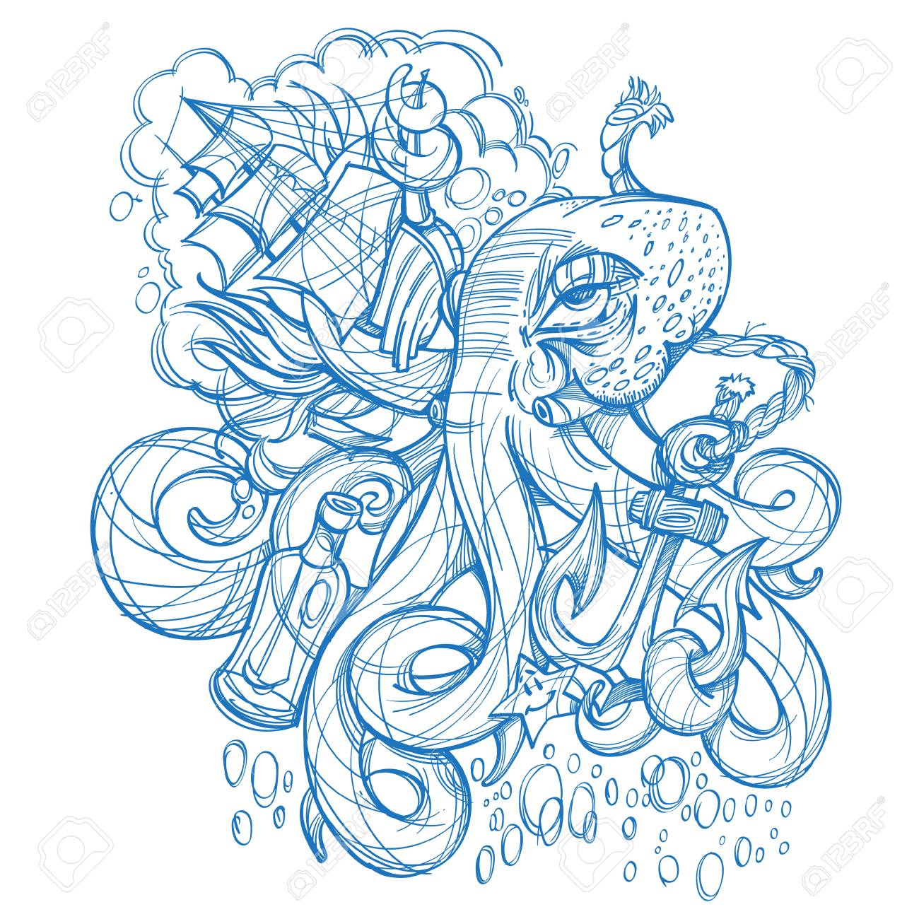 Octopus A Ship And A Frigate Anchored Outline Sketch Of A Tattoo Monochrome Illustration For Design T Shirts And Other Items Sea Monster Sticker Illustration For Coloring Royalty Free Cliparts Vectors And Stock